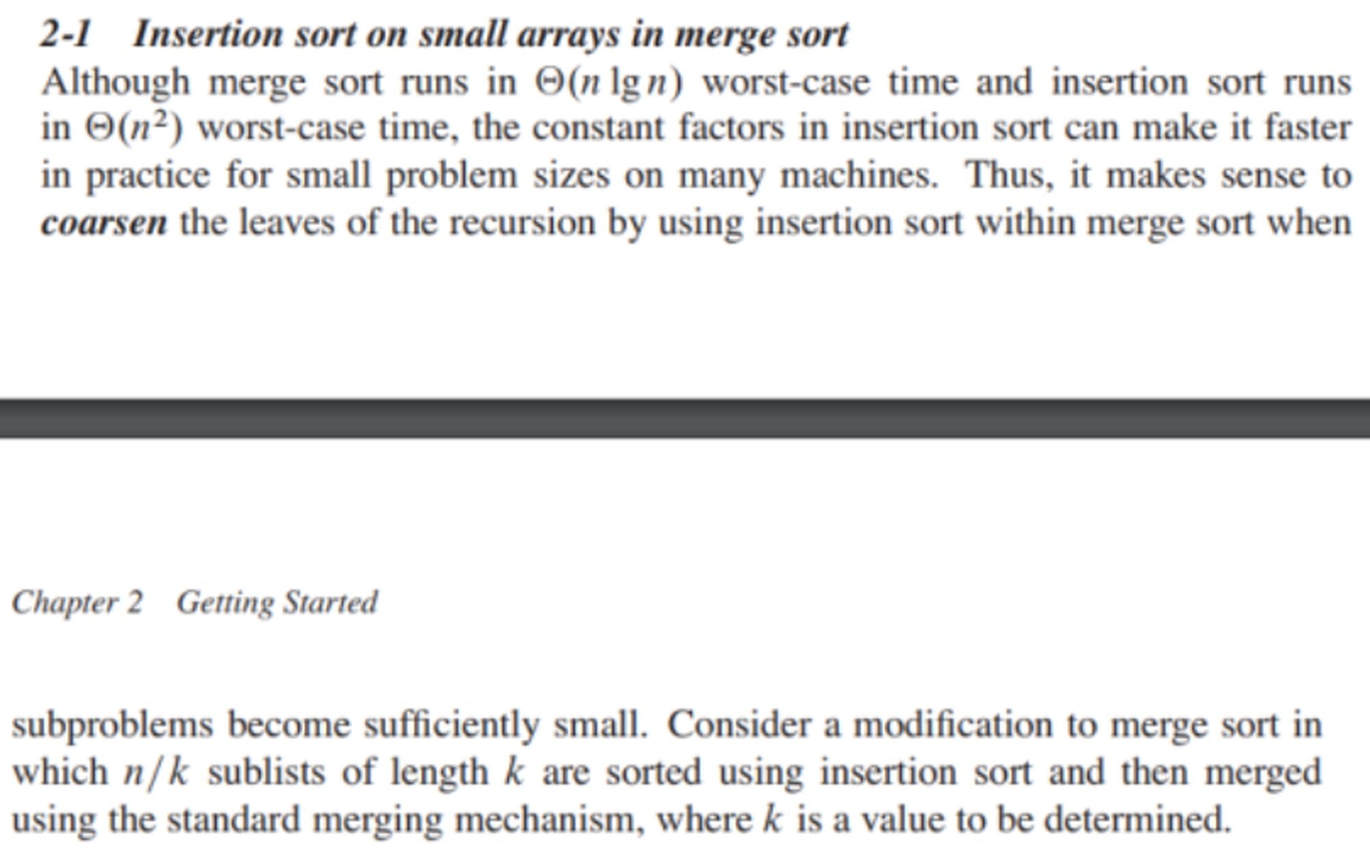 Elimizde normal merge sort'un zamanda çalıştığını biliyoruz. Bu modifiye edilmiş versiyonda ise, diziyi tane boyutunda alt listeye ayırıyoruz, her birini insertion sort ile sıraya diziyoruz (ki bu kısımların toplam maliyeti civarında) ve sonra hepsini birleştiriyoruz. Yanifg ortaya çıkan formül şöyle: