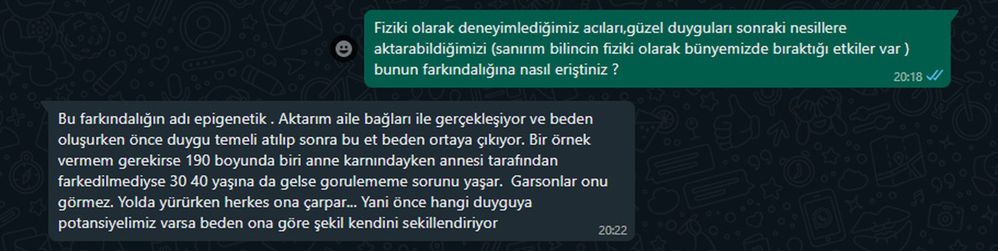 Bir 'İnsan ilişkileri uzmanın' yorumu. "Bu farkındalığın adı epigenetik . Aktarım aile bağları ile gerçekleşiyor ve beden oluşurken önce duygu temeli atılıp sonra bu et beden ortaya çıkıyor. Bir örnek vermem gerekirse 190 boyunda biri anne karnındayken annesi tarafından farkedilmediyse 30 40 yaşına da gelse gorulememe sorunu yaşar."