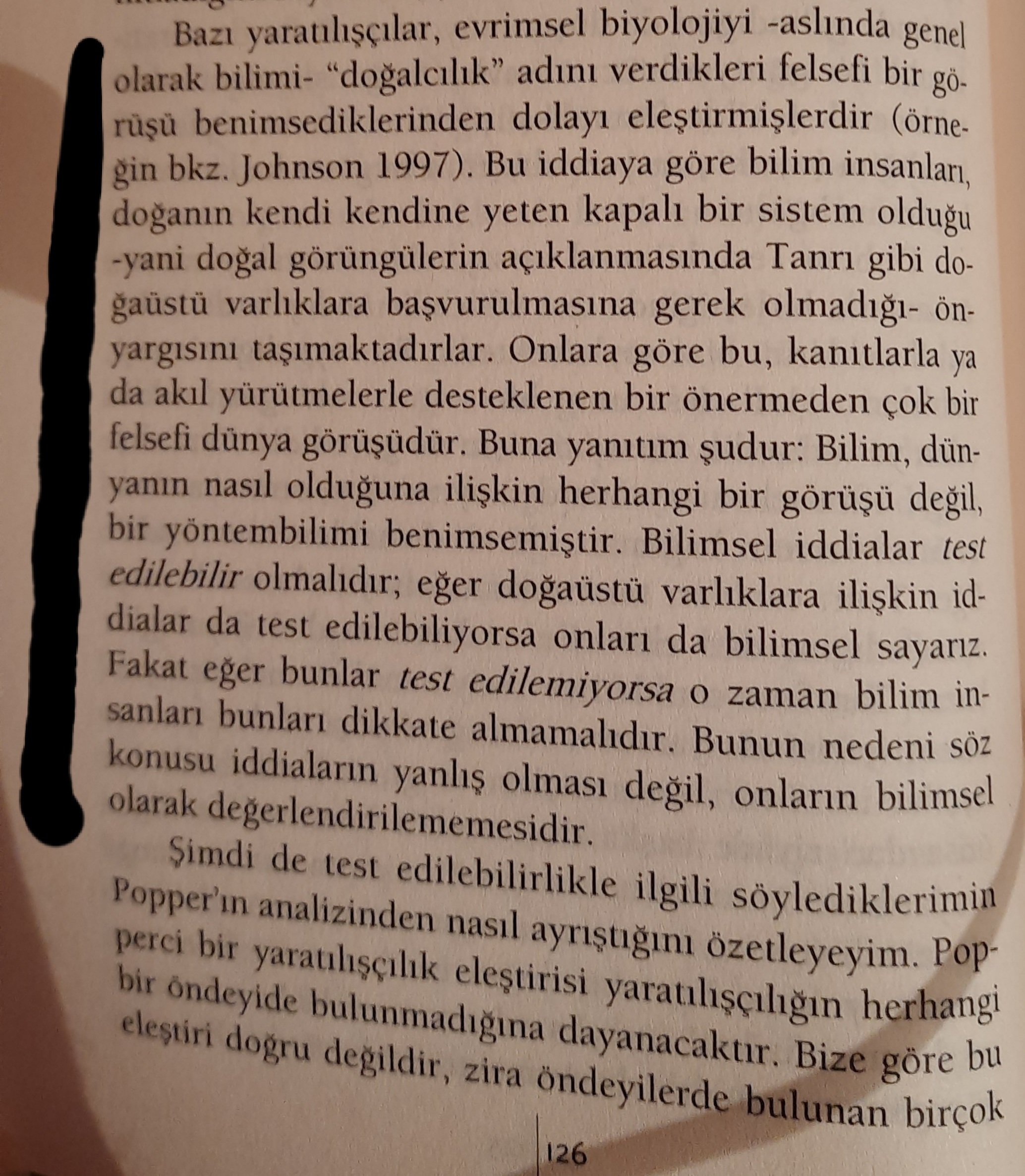 Yani attığınız sayfadaki ile tamamen aynı mantık. "Tanrı'ya gerek yok." diyerek metafiziksel doğalcılığın yöntemini kullandığı için yöntemsel doğalcılık denmiyor. Test edilemediği için bilim bu konuları önemsemiyor. Yöntemsel doğalcılıktan kastedilen de tam olarak bu zaten. Eğer ki doğaüstü konuları nesnel olarak test edebilecek duruma gelirse bilim, bu da değişir. Bilimin sınırları yani bu temel varsayımlar değişkendir zaten. Kitap sayfasında bunu da belirtmiş.