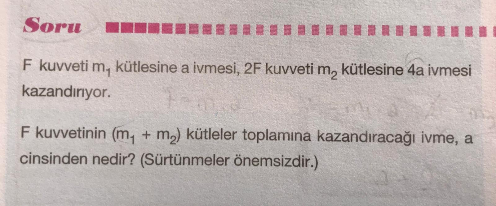 Eğer F kuvvet m1 kütlesine a ivmesi kazandırıyorsa, 2F kuvveti m1 kütlesine 2a ivmesini kazandırır (F=ma). Fakat m2'ye 2F kuvvetinin 4a ivmesini kazandırdığını görüyoruz. O halde m2 kütlesi m1 kütlesinin yarısı kadar olmalı. Eğer m2 yerine m1 cinsinden karşılığını yazarsanız cevaba rahatlıkla ulaşacaksınız. Eğer her bir durum için denklemi yazarsanız, çok daha kolay bir şekilde görebilirsiniz. Kolay gelsin.