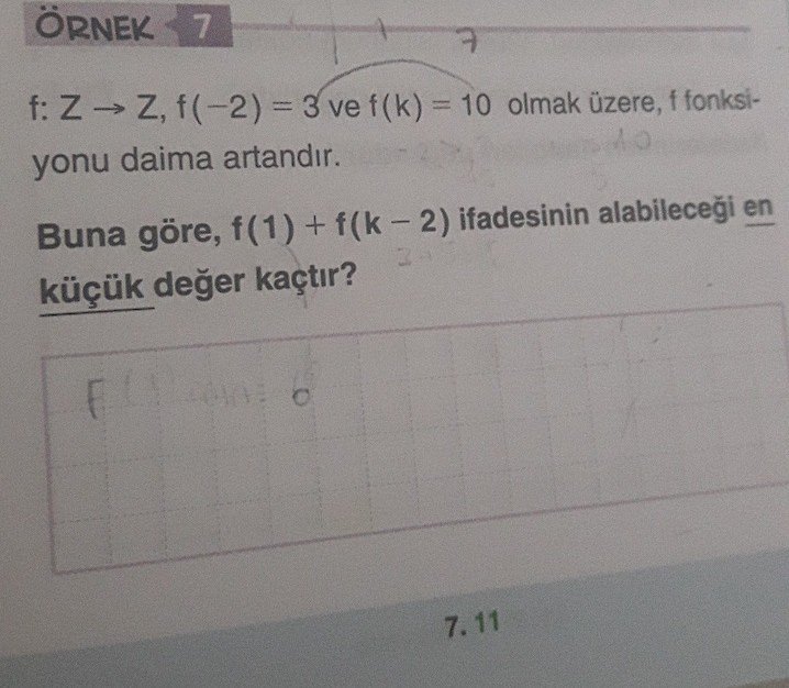 fonksiyon artan olduğu için ve f(k) f(-2)' den büyük olduğu için k (-2)'den büyük olmak zorunda. K 0 ile -2 arasındaysa f(k-2) 3'ten küçük. Eğer k 1 ile 0 arasındaysa f(k-2) 3'ten büyük, f(1) 10'dan büyük, cevap 13'ten büyük. Eğer k 1'den büyükse f(1) ve f(k-2) 3'ten büyük, cevap 6'dan büyük.