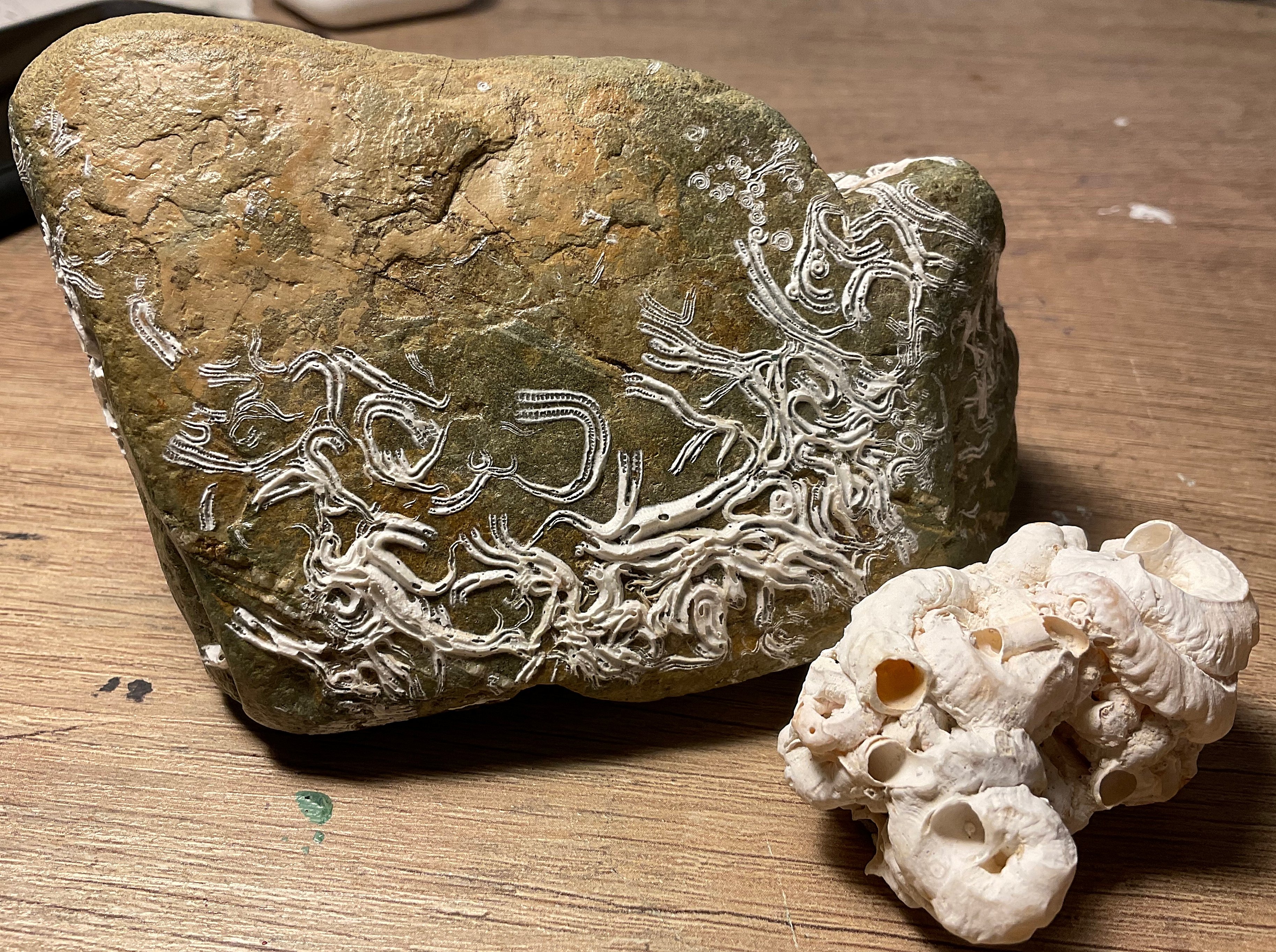 beyaz olan sağdaki tribolitmidi onlardan ve borumsu yumuşakçaların fosilleri soldakide evet canlıların izleride o tür kayalara sıkça rastlamak mümkün her denizde üniversite falan götürürsünüz belki ilginçdir yada meraklısı için saklayabilirsiniz.daha net bilenler yazar belki google görsellede sonuca ulaşabilirsiniz.