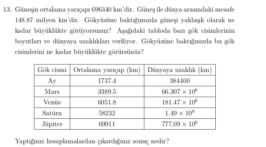 Gökyüzüne baktığımızda güneşi yaklaşık olarak ne kadar büyüklükte gördüğümüzü nasıl hesaplarız ?