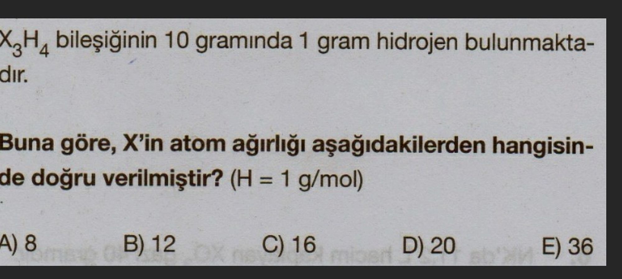 Cevap: X atomunun kütlesi 12 gram, yani B.