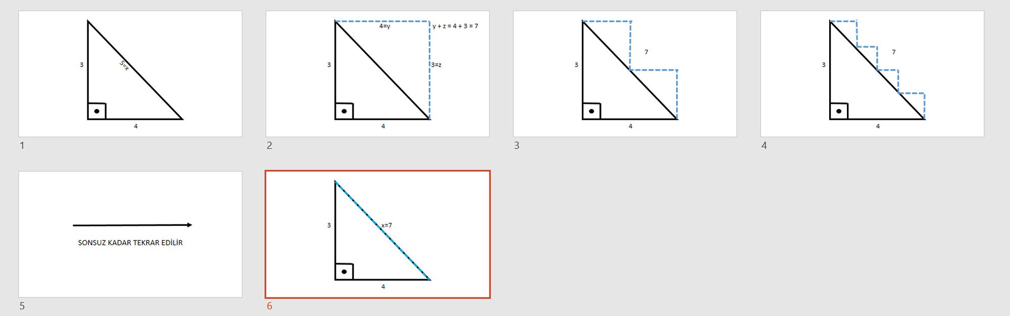 Sürekli olarak 4'ün yarısını ve 3'ün yarsını alarak üçgenler elde ederek sonsuza gidiyorsunuz. Sonsuza giderek bu sayıların sürekli yarısını alsanız da 0'a asla ulaşamazsınız. Yani üçgenin x kenarında her zaman (gözle görünmese bile) küçük üçgencikler hep olacaktır. Pisagor teoreminde bir sorun gözükmüyor.
