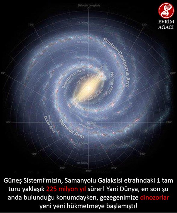 Örneğin; tahminlere göre galaksimiz Samanyolu, bir tam turunu 225-250 milyon yıl civarında tamamlar. Bu demek oluyor ki; Güneş, Samanyolu'nun etrafında en son şu anda bulunduğu konumdayken dinozorlar Dünya'ya yeni yeni hükmetmeye başlıyordu.