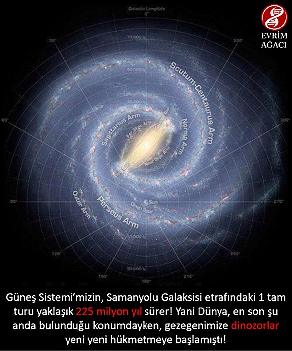 Örneğin; tahminlere göre galaksimiz Samanyolu, bir tam turunu 225-250 milyon yıl civarında tamamlar. Bu demek oluyor ki; Güneş, Samanyolu'nun etrafında en son şu anda bulunduğu konumdayken dinozorlar Dünya'ya yeni yeni hükmetmeye başlıyordu.