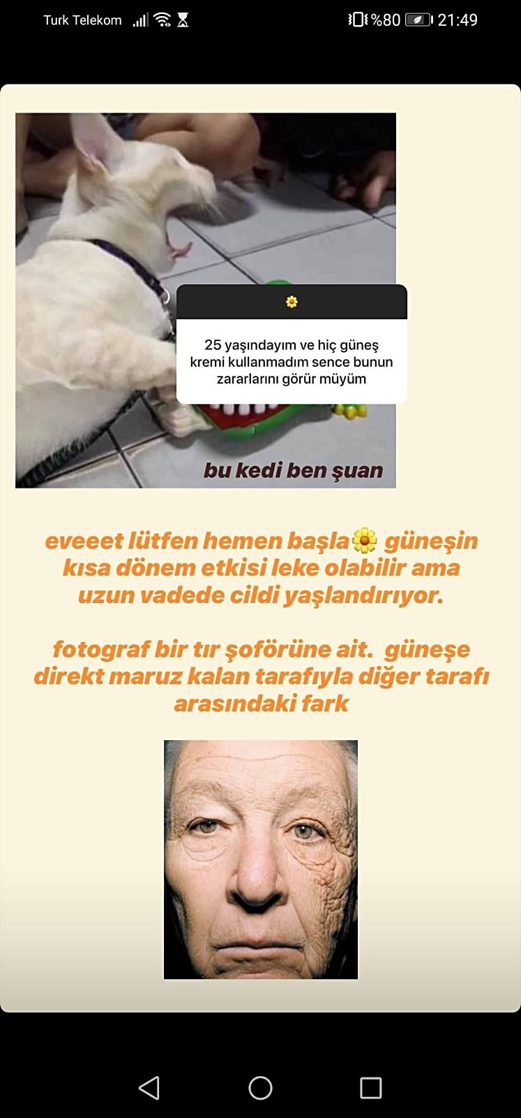 İlk önce gerekli önlemleri (güneş kremi vb. ) almazsak ne gibi zararları oluyor cildimize bundan bahsetmek istiyorum. Aslında nasıl su bizim için vazgeçilmez bir unsur ise güneş de aynı şekilde öyle. En basit örnekten başlayalım, Güneş ışınları D vitamini sentezinde çok büyük ve etkili rol oynar. İnsan vücudunda bulunan D vitaminin 90-95% i güneş sayesinde sentezlenir. Ancak, hayatın devamı için gerekli olan güneş ışınlarının zararlı etkileri de var. Güneşten gelen ultraviole ışınların cilde ve gözlere zarar verdiği bilinen bir gerçek. Uzun süre korumasız bir şekilde güneşte kalındığı takdirde cildimiz kurur ve leke oluşuma meyilli duruma gelir. Kuruması da kırışıklıklara sebebiyet verir. “Solar Lentigo” denilen güneş lekeleri, güneşte aşırı kalan kişilerde ani yanmalar, soyulmalar ve kızarmaların tekrarı durumunda yıllar içinde ortaya çıkıyor. Genetik eğilimler de güneş lekelerinin oluşumunda bir faktördür. Güneş kremi faydalarına gelirsek, ciltte leke oluşumunu erteleme veya engelleme özelliğine sahip, güneş yanıklarını önleyip nem sağlıyor ve bu da cildin erken kırışmasının önüne geçiyor ve elastikiyet sağlıyor diyebiliriz. Evet, güneş kreminin faydalarından bahsettim fakat ne zaman kullanmalıyız bu güneş kremini ? , sadece güneşli günlerde veya yazın mı sürmeliyiz ? Şöyle ki uzmanlar güneş kremini yaz, kış fark etmeksizin kullanılması gerektiği yönünde açıklamalar yapıyorlar. Ama hava kapalı ve bulutlu güneş yok niye süreyim diyenler çok . Hava her ne kadar kapalı olsa da güneş ışınları her zaman biz fark etmeden cildimize nüfuz ediyor. Bu nedenle elimizden geldiğince hem cilt sağlığımız hem de estetik görünümümüz için asla bırakmamamız gereken, alışkanlık kazanılması lazım olan bir durum güneş kremi kullanmak. Nasıl gün içinde su ihtiyacımızı belirli aralıklarla karşılıyorsak, güneş kremimizi de belirli aralıklarla tazelememizde fayda var.