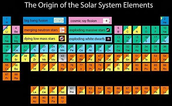 Vücudumuzdaki birçok kritik elementin - Oksijen (O), fosfor (P) ve kükürt (S) - süpernova adı verilen dev patlayan yıldızlardan geldiğini, diğerleri ise - karbon (C) ve azot (N) gibi - ölmekte olan, güneş benzeri yıldızlardan geldiğini gösteriyor. Bu arada suyun önemli bir bileşeni olan Hidrojen (H), Büyük Patlama'dan çıktı.