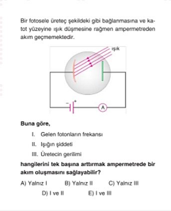 Soruyu çözen hoca sadece 1 olduğunu söylüyor.Ampermetreden akım geçmezse levhadan elektron kopmuyormuş ama ben öyle olduğunu düşünmüyorum.Levhadan elektron koparsa ama elektronların enerjisi yeteri seviyede olmazsa karşı levhaya çarpmadan durabilir.Bunu da hesaba katarak cevabın 1 ve 3 olması gerekmez mi ?