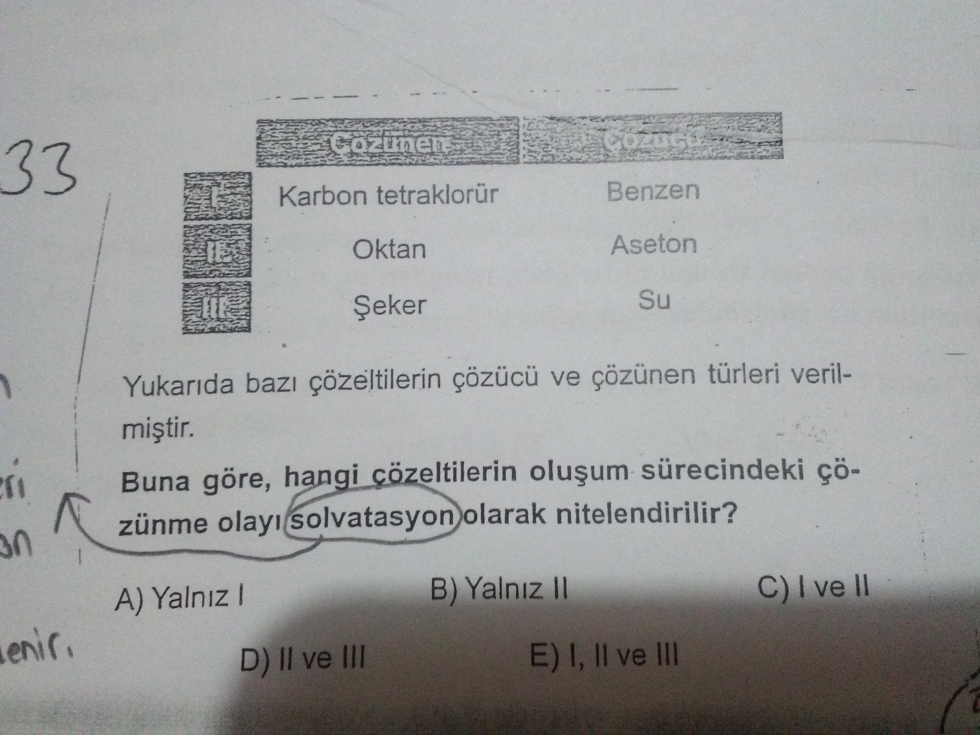 - öncülde CCL4 ve C6H6 (ikisi de apolar olduğu için) birbirleri içinde çözünürler. Çözücü su harici bir madde olduğu için bu çözünme solvatasyon örneğidir.