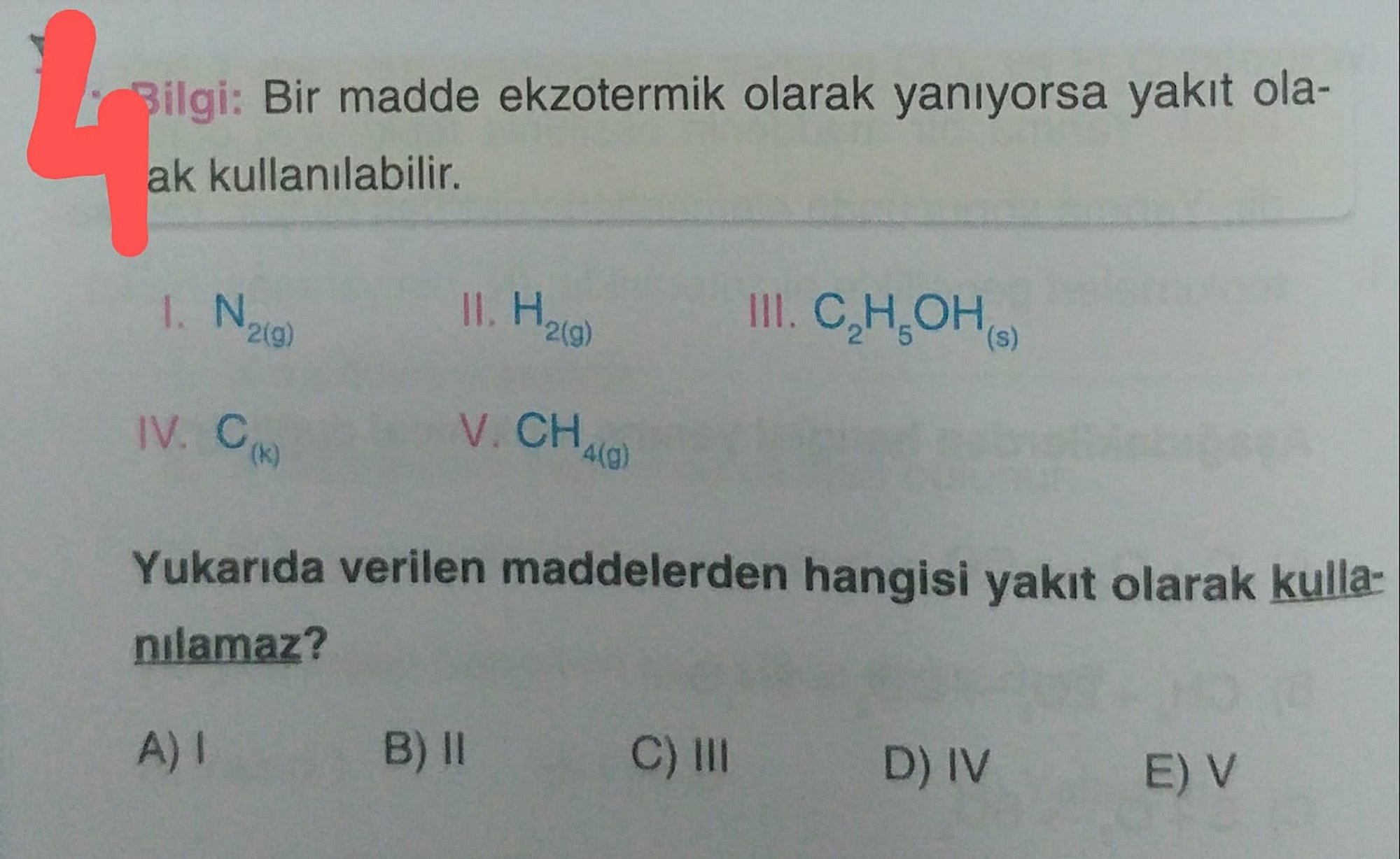 Üstte verilen bilgiye göre ekzotermik bir yanma gerçekleşir ise yakıt olarak kullanabiliyoruz. Soru bizden ekzotermik yanmayacak bir madde istemekte. Yanma tepkimeleri Hidrojen,Karbon gibi elementlerin bulunduğu Hidrokarbon bileşiklerde ekzotermik bir şekilde gerçekleşir. Aynı zamanda organik maddelerin yanma tepkimesi de ekzotermiktir. Azotun yanması endotermik gerçekleşen bir durumdur. Bu yüzden azot yakıt olarak kullanılamayacaktır yani cevap A şıkkı.