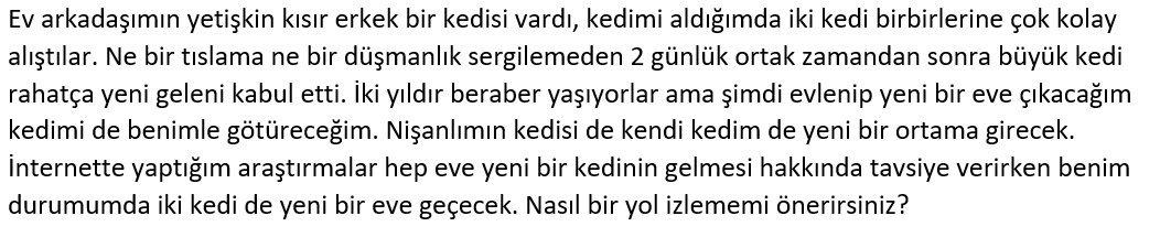 Başlangıç olarak; kediler evrimsel süreçte soliter yani yalnız yaşamaya adapte olmuş canlılardır. Dolayısıyla her zaman yeni kedilerle aynı ortama girmek bir stres kaynağıdır. Üstelik kediler değişiklikten de hoşlanmazlar, bırakın tüm evi değiştirmeyi, evin içinde bir eşya değiştiğinde dahi rahatsız olabilirler. Öncelikle yapmanız gereken stresi minimuma indirmek. Her iki kedinin de bildiği, tanıdığı, sevdiği eşyaları veya oyuncakları onlarla birlikte yeni evinize götürebilirsiniz. Bu alışma sürecinde kedilerinizi rahat bırakın, sizinle sık temasa geçmek istemezlerse onları zorlamayın.