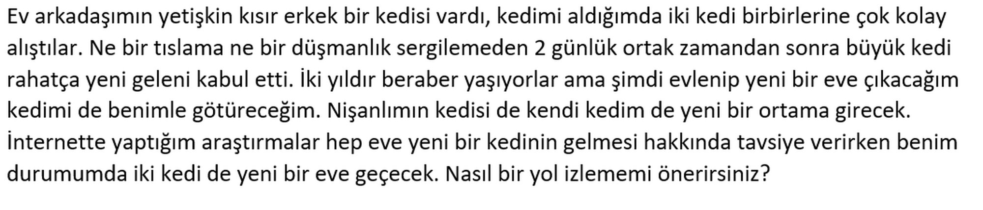 Tekrar ediyorum, önemli, bu konunun bir davranış uzmanına danışılması gerekmekte. Her iki kediyi de ayrı odalara kapatarak başlayabilirsiniz. Bu, her iki kedinizin de yeni eve adapte olma süreçlerine yardımcı olacaktır. Çünkü koskocaman bilinmeyen bir ortama alışmaktansa küçük ve bilinmeyen bir ortama alışmaları daha kolay olacaktır, zamanla evin başka bölümlerini de kullanımlarına açarak yavaş yavaş evi tanımalarını sağlayın. Günün belli saatlerinde, kısıtlı bir zaman aralığında birbirleriyle görüştürün ve bu zamanı giderek arttırın. Birlikte olacakları bu zamanda eğer birbirleriyle iletişim kurmak istemezlerse onları zorlamayın. Aynı zamanda kedilerinizin kokularını birbirleriyle takas etmeniz de alışma sürecini hızlandırabilir. Bunu bir kedinizin kullandığı bir eşyayı diğer kedinizin odasına koyarak yapabilirsiniz. Her iki kedi için de bunu uygulayın.