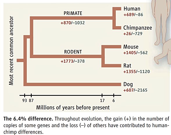 Mesela bahsettiğiniz sayfada, bir araştırmaya göre insan ve şempanzeler arasında %6,4 fark bulunduğu hesaplanmış. Paylaşılan evrimsel soy ağacına dikkat edin. İnsan ve şempanze hala en yakın akraba, fare ve köpek ise daha uzak akraba. Akrabalık beklediğimiz gibi çıktı, %1,23 olması da %5 olması da %6,4 olması da akrabalık derecesini etkilemiyor.