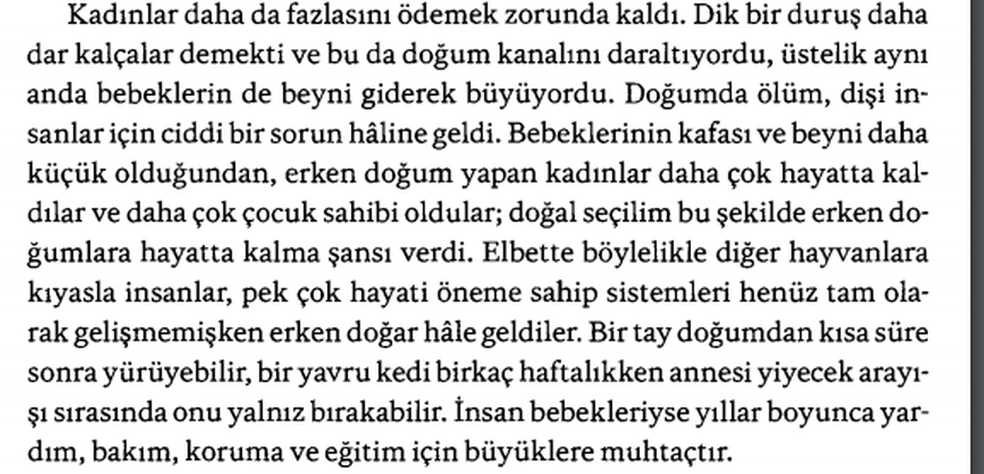 Antropologların bahsettiği yenidiğanlardaki acziyet hemen hemen her türde var. En barizi de kuşlar, yumurtadan çıkan kuş da bakıma muhtaç. Kompartımanlı mideliler, zürafa, at, fil gibi hayvanlar dışında doğduktan kısa bir süre sonra ayağa kalkabilen yavru yok aslında. Yani çoğunlukla yenidoğanlar bakıma muhtaç, insana özel bir durum değil.