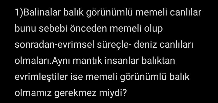 Balinalar balık görünümlü memeli canlılar bunu sebebi önceden memeli olup sonradan-evrimsel süreçle- deniz canlıları olmaları.Aynı mantık insanlar balıktan evrimleştiler ise memeli görünümlü balık olmamız gerekmez miydi?