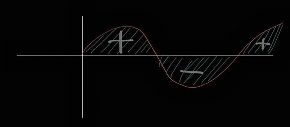 Bu rasgele bir fonksiyon olsun. Şimdi fonksiyona bakarsak aralığında pozitif, aralığında negatif değer veriyor. Şimdi integrali gerçekten anlamak için temel teoremini bilmeniz gerekiyor. Teoreme ve ispatına buradan bakabilirsiniz. Burada önemli olan kısım alan hesaplarken kullanılan yöntem: