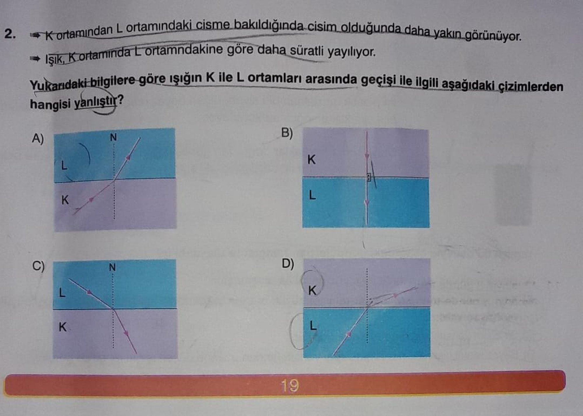 A şıkkında K'dan çıkan ışık L ortamında yüzey normaline yakınlaşarak gelmiş. Bu şık doğrudur çünkü L daha yoğun bir ortam.