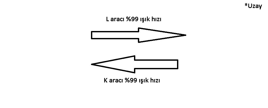 şimdi 2 aracımız olsun ikisi de sürtünmesiz Uzay da birbirlerine zıt yönlü hareket etsinler ve ikisi de ışık hızının %99'u ile seyahat ediyor olsun şimdi rastgele bir araçtan öbür araca baktığımızda ters yönde giden aracı ışık hızından daha hızlı gidiyor olarak mı görürüz?