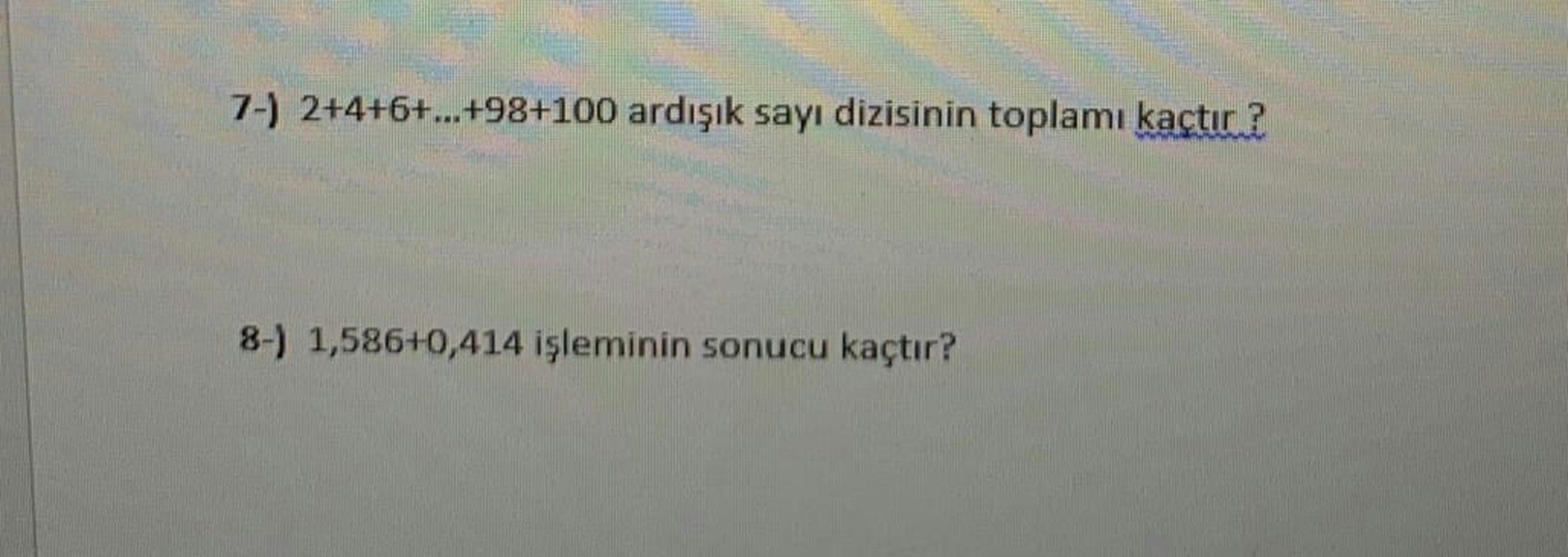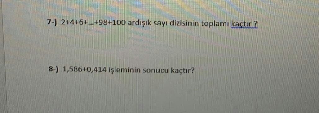 normalde bunu ilk gauss un çocukken çözdüğü düşünülüyor ama tabiki ilerki zamanlarda bunun bir formülünü çıkartmış aslında 1 den başlayarak olsaydı sondaki sayı ile toplandığında 101 ettiği bariz ve dizinin ortasına yaklaştıkça yani 2+99 , 3+98 , 4+97 , 5+96 bunların hepsi 101 e eşit. Böyle olduğunu bildiğimiz için toplamda da 100 sayı olduğunu biliyoruz yani elimizde 50 tane 101 var toplam sonucumuz 50*101=5050 ama istediğimiz sonuçta 1 yok yani 5049