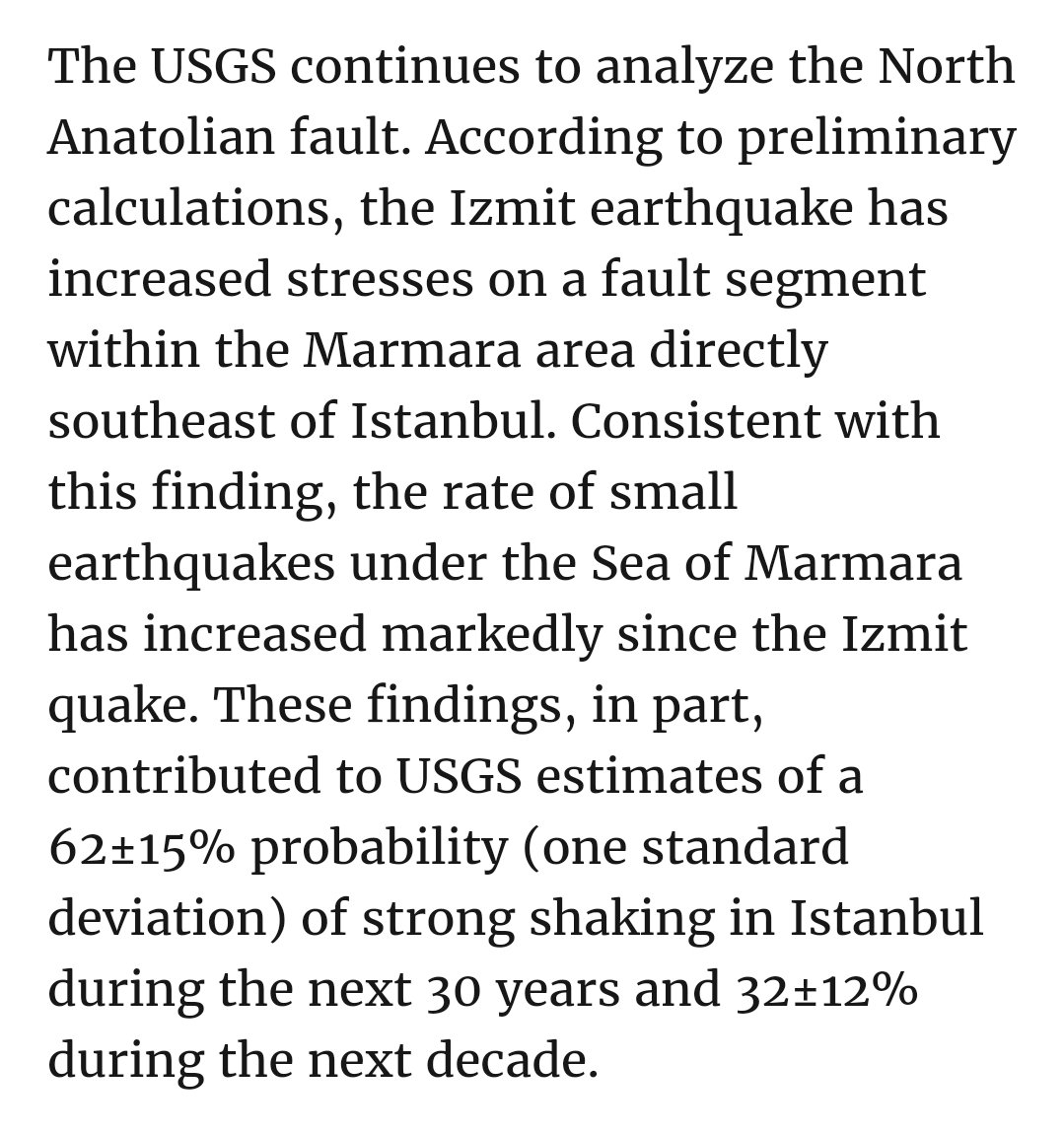 Evrim Ağacı'nın 5 yıl önceki deprem konulu videosunu izledim. Videoda USGS verilerine göre İstanbul'da en az 7.0 büyüklüğünde bir depremin gerçekleşme olasılığının %70 olduğunu söylüyor. Ancak USGS'nin resmi sitesinde son 30 yıl içerisinde 62±15%, son 10 yıl içerisinde 32±12% olasılıkla "güçlü" bir deprem olacağı yönünde. Yoksa 7.0 güçlü değil mi?
