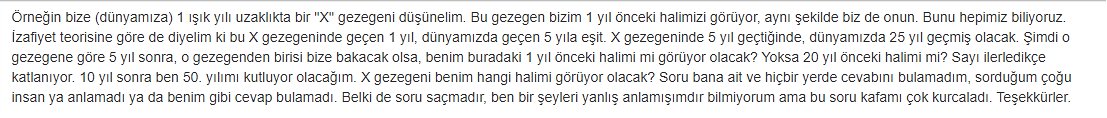 Sizin sorunuzda ki gezegenden gelen ışık hep aynı uzaklıkta olacak tabi aradaki mesafemiz değişmediği sürece ama ikisine de portalla ışınlanma imkanınız olsa ve bir klonunuzu oraya gönderseniz, birinde 1 yıl yaşadağınızı diğerinde 5 yıl yaşarsınız.Aradaki mesafenin de değişme teorileri var hatta ışık spektrumlarındaki dobbler efektinden ölçebiliyorlar, ilginiz varsa okumanızı tavsiye ederim ..