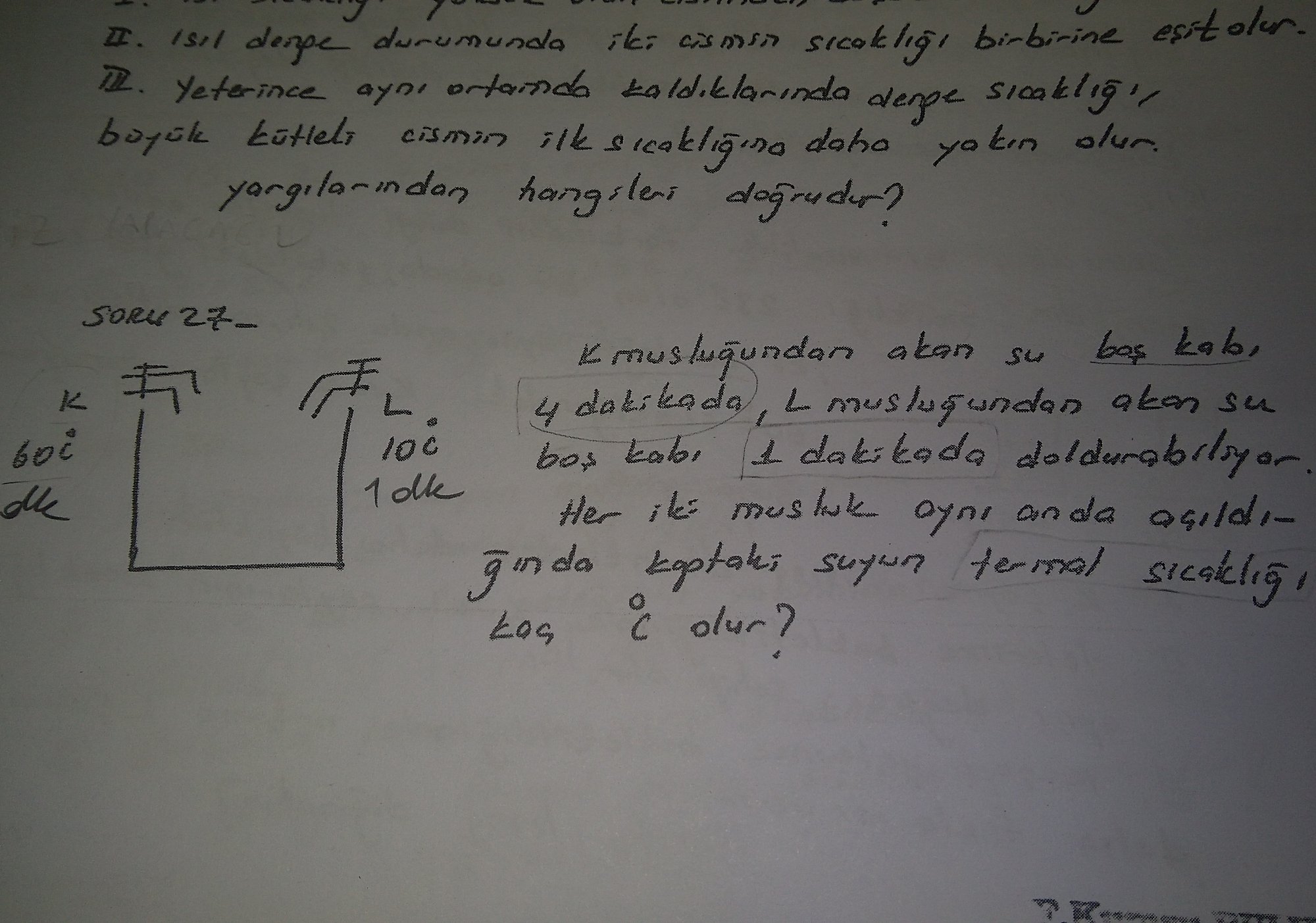 K musluğundan akan su boş kabı 4 dakikada, L musluğundan akan su boş kabı 1 dakikada doldurabiliyor. Suyun termal sıcaklığı kaç olur?