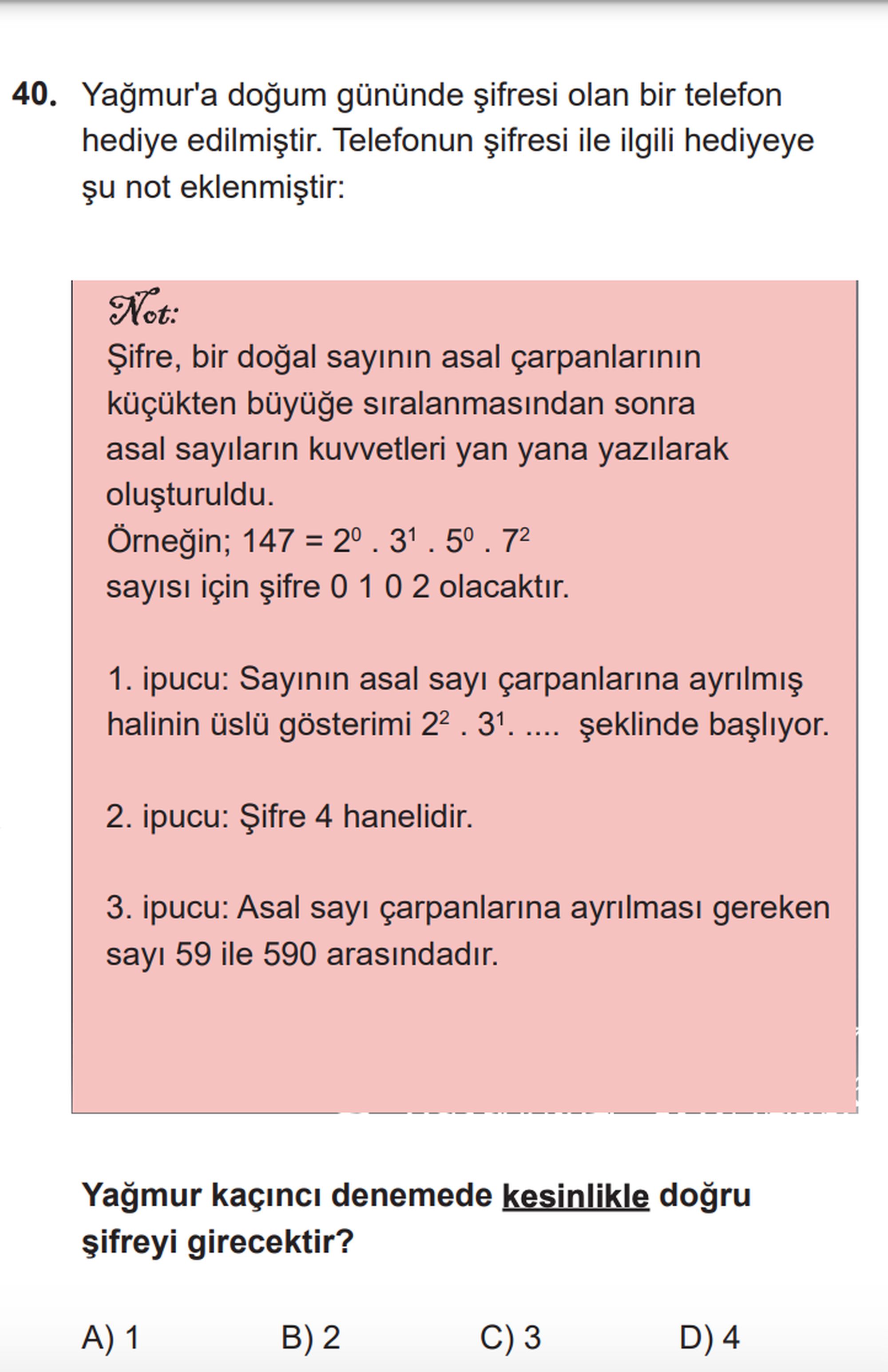 Sorunun 1. ipucunda verilen bilgiye göre şifrenin ilk 2 hanesi 2-1 şeklinde olmalı, devamı için ise 5 ve 7nin üsleri şifrenin 3 ve 4. haneleri olacak şekilde denemeler yapılmalı. Verilen koşula göre 59 ile 590 arasında olması gerektiğinden bunu sağlayacak şekilde denemeler yapılır. Buna göre şifre 2-1-1-0 olduğunda asal çarpanlarına ayrılan doğal sayı 60, 2-1-0-1 olduğunda 84, 2-1-1-1 olduğunda 420, 2-1-2-0 olduğunda ise 300 değerini bulmaktayız. Buradan sonraki üs değerlerinde 59-590 aralığında olmadığı için 4. denemede kesin olarak sonucu bulmuştur.