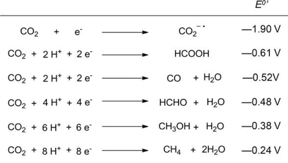 Karbondioksitin indirgenmesi ile elektroliz hücresinin katot kısmında bir çok ürün oluşabilir. Bu ürünler başlıca formik asit, karbonmonooksit, metan, etan ve etil alkoldür. Tabiki de katalizörlere bağlı olarak bu ürünler daha baskın olabilir. Örneğin kalay katalizörlüğünde formik asit(HCOOH), gümüş katalizörlüğünde karbonmono oksit(CO), bakır katalizörlüğünde metan (CH4), etan (C2H4) ve etanol (C2H5OH) diğer ürünlere göre daha çok açığa çıkar. Bunların dışında eser miktarda metanol, propanol ve bütanol de oluşabilir.[1] Bu tepkimlerde kullanılan protonların kaynağı sudur. Sudan ayrılan protonlar katota tepkimeye girerken oksijen (O-2 ) iyonları anot kısma geçer.