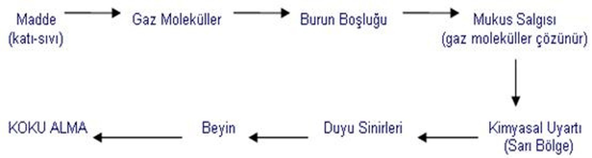 Koku taşıyan her molekül insan nefes alırken hava ile birlikte burundan girip koku alma bölgesine erişmek zorundadır. Bunun katı, sıvı yada gaz olması bir istisna teşkil etmez.[1] Eğer katı olan bir şeyin kokusunu alıyorsan bir şekilde bu katı malzemeden havaya moleküller karışıyor demektir.