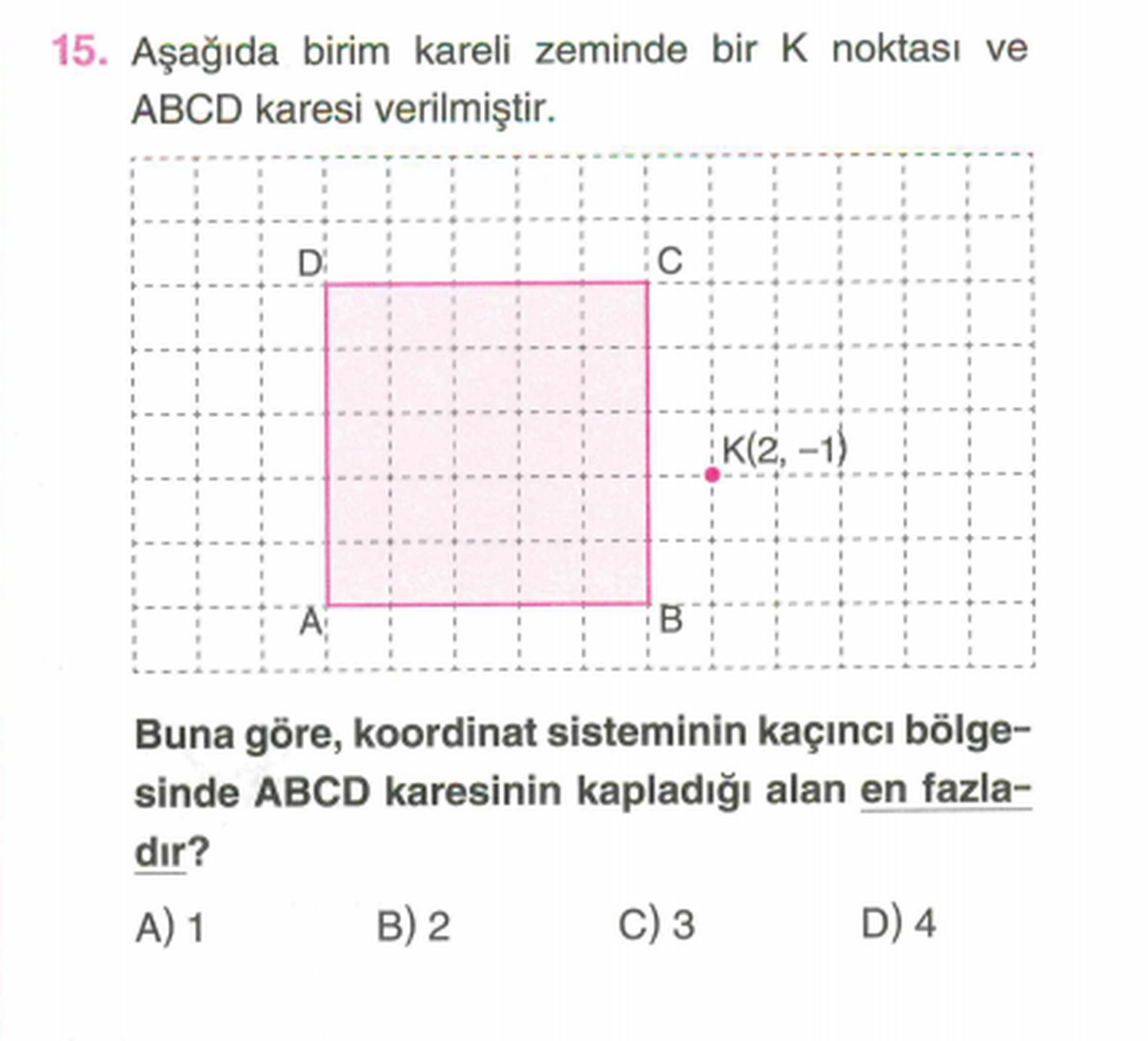 Kareli zemin üzerinde bulunan K noktasının koordinatları K(2,-1) şeklinde. Yani x ekseninin (apsis) değeri 2, y ekseninin (ordinat) değeri ise -1. Koordinat sistemini oluşturabilmemiz için orijini (0 noktası) bulmamız gerekiyor. Orijini bulmak için K noktasından 1 birim yukarıya daha sonra 2 birim sola gitmeliyiz. Ulaştığımız nokta koordinat sisteminin orijini oluyor. Oluşan koordinat sistemi üzerinde ABCD karesinin kapladığı alan, 1. bölgede 2 birim, 2. bölgede 8 birim, 3. bölgede 12 birim, 4. bölgede ise 3 birim oluyor. O yüzden sorunuzun cevabı C şıkkı olacak.