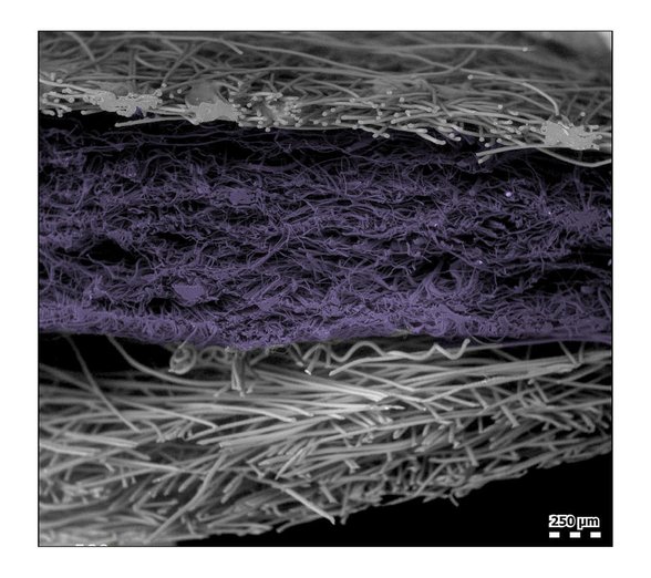 3 katlı maskelerde bulunan bu katmanların daha da profesyonel bir şekilde çekilmiş mikrografı ise şu şekilde: