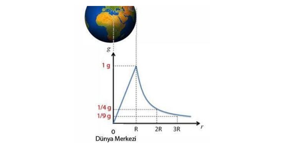 Rdeki yani dünyanın kabuğundaki yer çekimine k dersek R/2 deki bi noktada kütle çekim kuvveti k/2 olucaktır