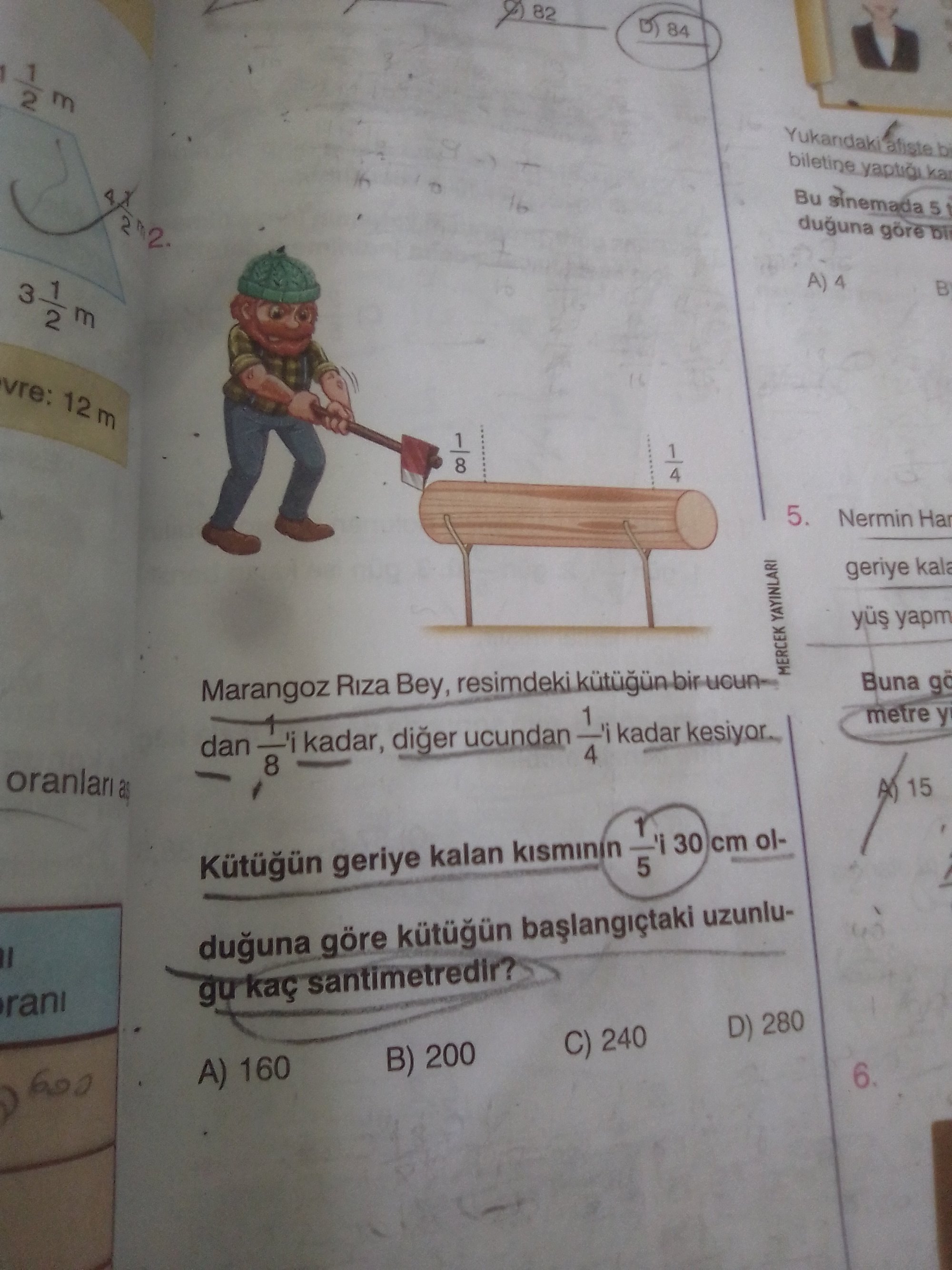 4-5-8'e bölünen en küçük sayıyı seçelim: 40x olsun. (OBEB- OKEK SORULARI) 40x'in 1/8'i 5x yapar; aynı şekilde 40x'in 1/4'ü 10x yapar. Toplamda 15x odunun uzunluğundan gitti ve geriye 25x kaldı. Soruda ise kalan kısmın 1/5'i 30'a eşitmiş, 25x'in 1/5'ini alırsak 5x olur ve 5×=30'dan x=6 sonucuna varırız. Başlangıçtaki uzunluğu olan 40x kısmında x yerine 6 yazdığımızda sonuç 240 olur.