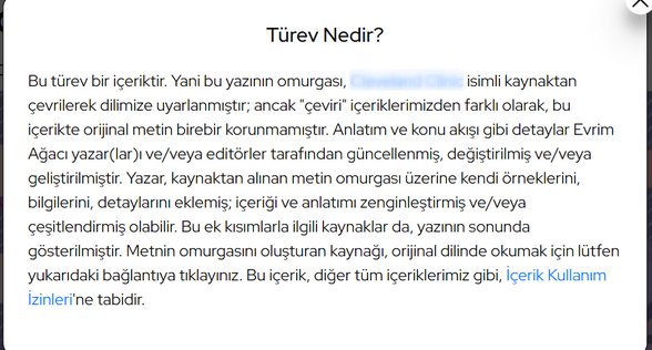 Türev İçerikler: Bu içeriklerin omurgası, bir diğer kaynaktan çevrilerek dilimize uyarlanmıştır; ancak "çeviri" içeriklerimizden farklı olarak, bu içerikte orijinal metin birebir korunmamaktadır. Anlatım ve konu akışı gibi detaylar Evrim Ağacı yazar(lar)ı ve/veya editörler tarafından güncellenmekte, değiştirilmekte ve/veya geliştirilmektedir. Yazar ve/veya editörler, kaynaktan alınan metin omurgası üzerine kendi örneklerini, bilgilerini, detaylarını eklemiş; içeriği ve anlatımı zenginleştirmiş ve/veya çeşitlendirmiş olabilmektedir. Bu ek kısımlarla ilgili kaynaklar, yazıların sonunda gösterilmektedir.