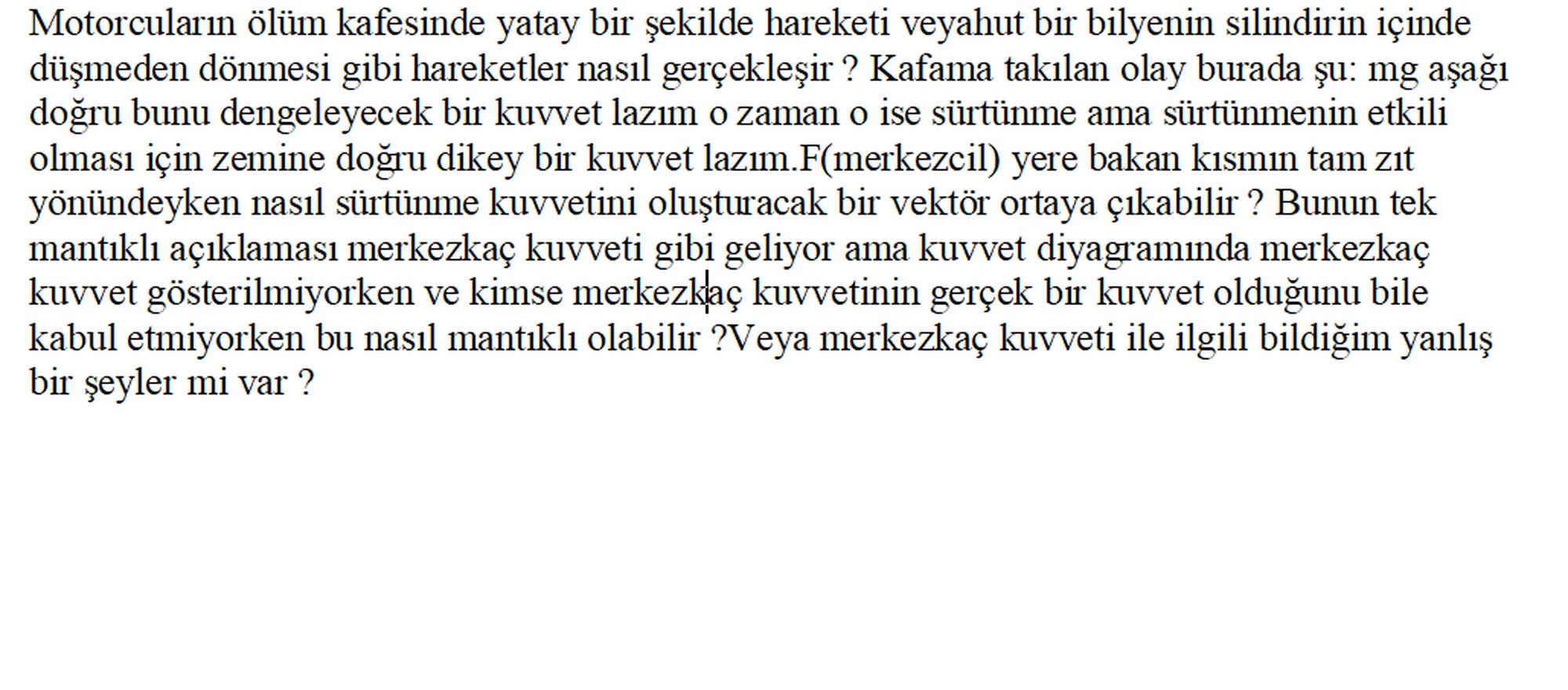 Sırasıyla problemi irdeleyelim: Bir hareket mevcut olduğuna göre, Newton'un 2. Yasası gereği ivmeyle doğru orantılı bir net kuvvet olmalıdır (yani net kuvvet sıfırdan farklı). Bilyenin serbest cisim diyagramını çizersek bilye üzerindeki kuvvetlerin ağırlık, ağırlığına ters ve eşit büyüklükte sürtünme kuvveti ve merkezcil kuvvet olduğunu göreceğiz. Burada her zaman akılda bulundurmamız gereken bir nokta da şu: Merkezcil ivme büyüklük olarak değişmiyor, ancak yönü değişiyor; yani ivme -dolayısıyla kuvvet- sabit değil (vektörel olarak). Sonuç olarak değişken bir ivmeden bahsediyoruz. Kilit noktayı fiziksel açıdan sağduyumuza hitap edecek şekilde şöyle açıklamak mümkün: Yine bilyenin serbest cisim diyagramına dönersek, merkezcil kuvveti silindirin bilyeye uyguladığı tepki kuvveti olarak düşünebiliriz, yani bu durumda silindirin serbest cisim diyagramını incelersek bilye de silindire bir kuvvet uyguluyor (merkezden dışa doğru) ancak dediğim gibi bu kuvvet bilyenin değil silindirin üzerinde. Böylece görürüz ki silindirin bilyeye uyguladığı tepki kuvvetiyle bilyenin çembersel hareketini sağlayan kuvvet aslında aynı kuvvet.