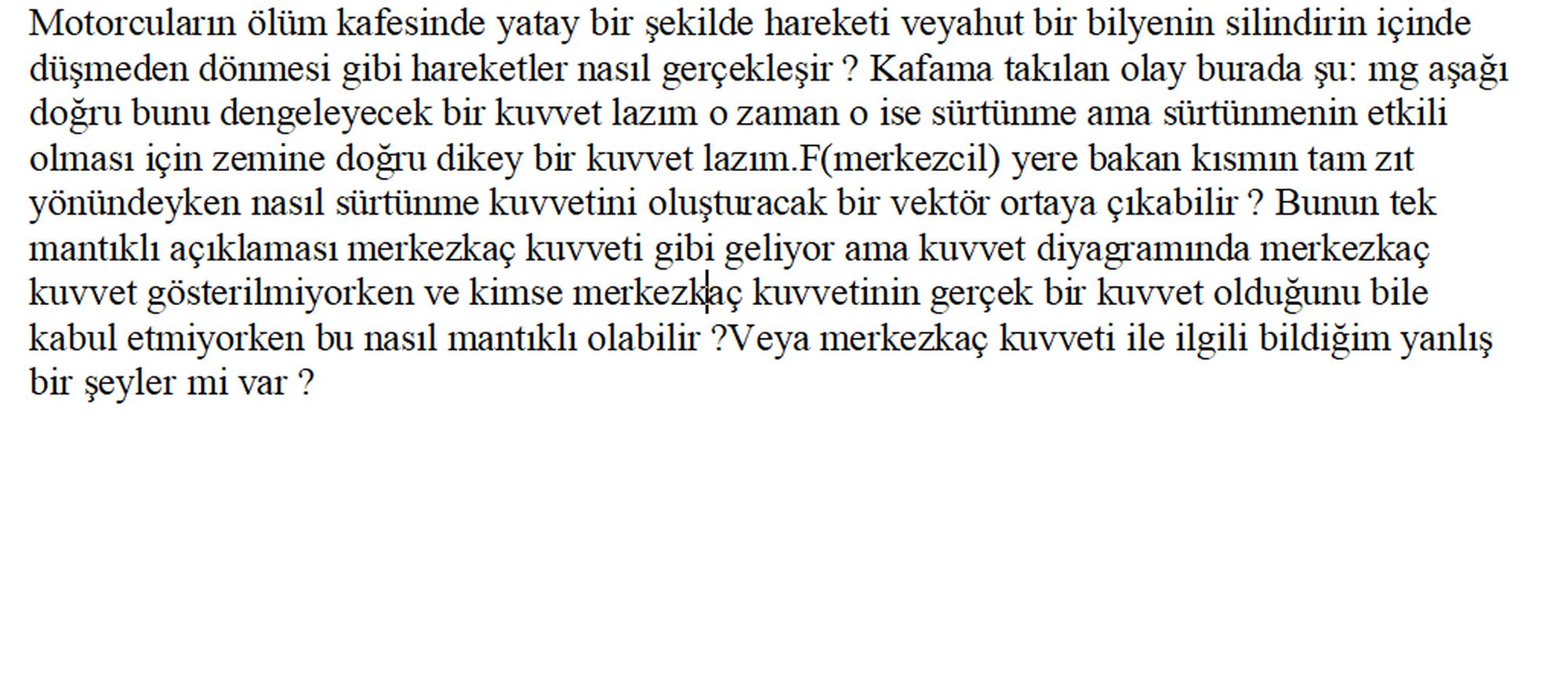 Karakter sınırından dolayı görsel olarak koydum. Alttaki metine ek olarak şimdi aklıma şu da geldi: Eğer bir yayın ucuna bir cismi bağlarsanız ve onu çembersel olarak döndürürseniz yay uzamaya başlar ama f(merkezcil) içeri doğru yani yayın kısalması gerekmez mi normalde ?