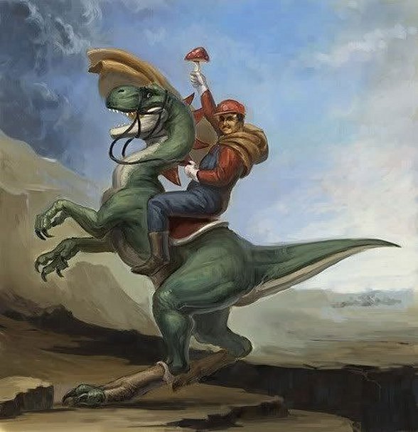 internetten bulduğum rasgele foto. ilk gördüğümde iç sesim susuyor, gözlerim inceliyor. diyorum ki bu resim Napolyon'un ünlü tablosuna benziyor, adamda Süper Mario'ya. önce kendime betimleme gereği görmüyorum, zihnimde tüm detaylar var zaten. sonra bazı detayları yorumlayarak, eşleştiriyorum, mesela mantar Mario'nun yediği mantar, dinozor Marionun öldürdüğü dinozor, dinozorun kaplumbağa kabuğu gibi şeyi burda at semerine benzetilmiş falan gibi.