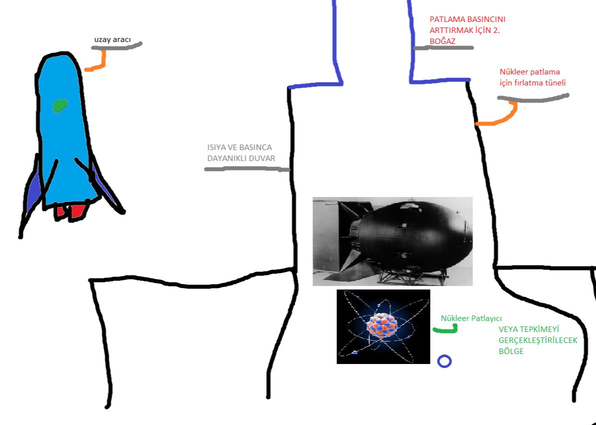 Mesela çocukluğumuzda yaptıgımız torpilin ustune demir tas koyup patlatmak gibi fakat bu sefer biraz daha gelişmişi . nükleer patlamayı kontrollü bir şekilde yaparak uzay aracı yükseldikten sonra aracın kendi motorları devreye girecek bu mümkün olurmu ? tam anlatabildimmi bilmem ama umarım anlatabilmişimdir. :)