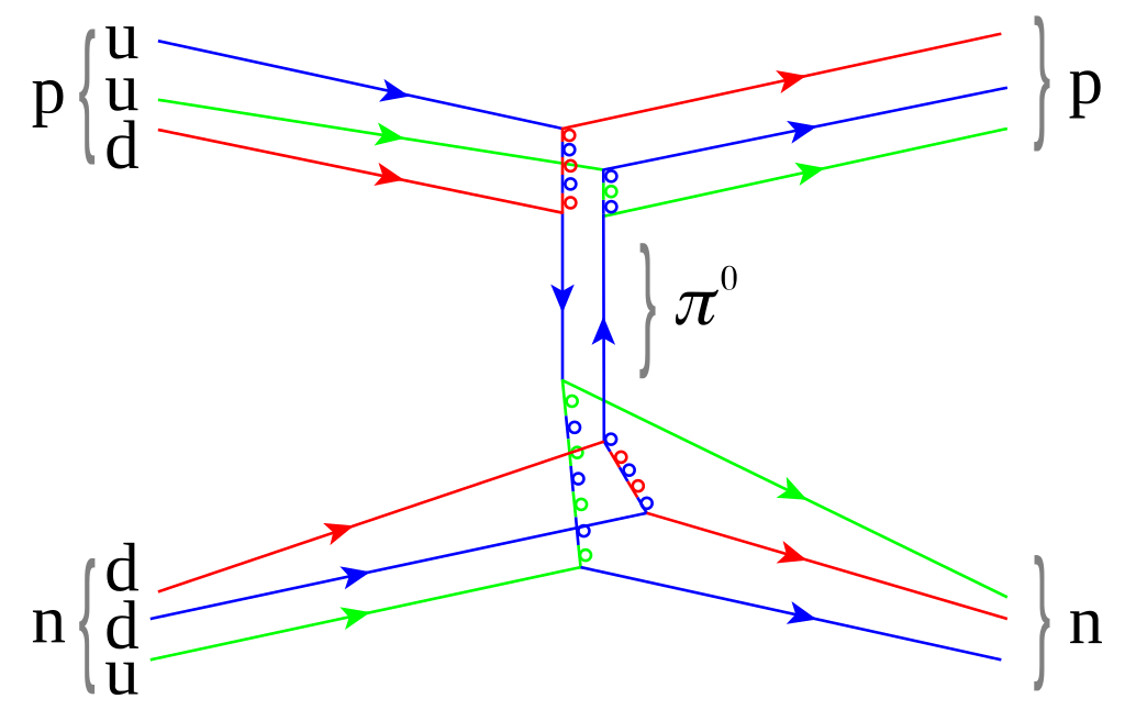 Biliyoruz ki kuarklar arası güçlü nükleer kuvvet gluonlar tarafından, nükleonlar arası ise mezonlar tarafından sağlanıyor. Kuarklar arası "sicimi" koparabilmek için oldukça yüksek enerjiler gerekiyor ve sonuç olarak jet denen olay yaşanıyor lakin benzer bir durum sürekli halde gerçekleşiyor. Nükleonlar arası pionlar nasıl oluşuyor?