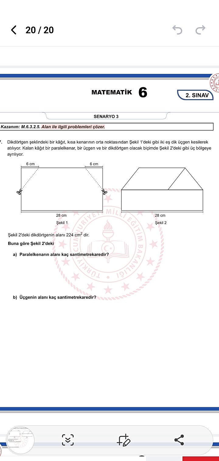 Aşağıdaki dikdörtgenin alanından (224), bölünmüş kısımın enini 8 olarak (=224/28) buluruz. Büyük dikdörtgen ,ortadan bölündüğünden, onunda bir kısa kenarı 8 cm olmalı.