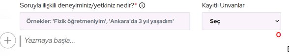 Unvanınızı cevap yazdığınız panelin hemen üstünde "Soruyla ilişkili deneyiminiz/yetkiniz nedir?" yazısının altındaki metin kutusuna kendiniz girmelisiniz. Cevap girdiğinizde yazdığınız unvan kaydolacak ve sonraki cevaplarınızda da aynı unvanı "Kayıtlı Unvanlar" açılır menüsünden seçebileceksiniz. Tabii ki her zaman başka bir unvan girebilirsiniz.