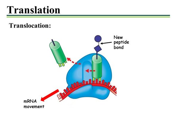 İlk olarak mRNA hareketini ele alalım. mRNA ve diğer tüm nükleik asit dizilerinde 5 üssü uç ve 3 üssü uç tanımı vardır. Bu molekülün yapısına atfedilen bir tanımdır ve 5 üssü uç okunacak DNA veya mRNA parçasının ilk bazına denk gelir. Sonuç olarak mRNA 5 üssü ucundan 3 üssü ucuna doğru okunur ve bu sırada belirli bir yönde ilerlemiş olur. Bu ilerleme için fiziksel enerjiyi ribozomda GTP yıkımı sağlar. Ribozom da hem kendi içinde konformasyonel olarak değişiklikler yaşayarak hem de mRNA üzerinde hareket eder ve tüm bu hareketlere translokasyon denir. tRNA'lar ise ribozomda sırayla özel ceplere girerler ve amino asitlerin tek tek birbirlerine bağlanmasını sağlarlar, peptid bağı oluşumunda hareket edenler de sonuç olarak tRNA'lardır.