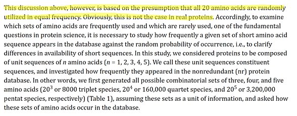 Ancak yukarıdaki tartışma, 20 amino asidin tamamının eşit sıklıkta rastgele kullanıldığı varsayımına dayanmaktadır. Tabii ki gerçek proteinlerde durum böyle değildir. Bu çerçevede, protein bilimindeki temel sorulardan biri olan hangi amino asit kümelerinin sıklıkla hangilerinin nadiren kullanıldığını incelemek için, belirli bir kısa amino asit dizisi kümesinin rastgele ortaya çıkma olasılığına karşı veri tabanında ne sıklıkta göründüğünü incelemek, yani kısa dizilerin kullanılabilirliğindeki farklılıkları açıklığa kavuşturmak gerekir. Bu çalışmada, proteinlerin n amino asitlik birim dizilerden oluştuğunu düşündük (). Bu birim dizileri kurucu diziler olarak adlandırdık ve nonredundant (nr) protein veritabanında ne sıklıkla göründüklerini araştırdık. Başka bir deyişle, öncelikle üç, dört ve beş amino asitten oluşan tüm olası kombinatoryal kümeleri (sırasıyla 203 veya 8000 üçlü tür, 204 veya 160.000 dörtlü tür ve 205 veya 3.200.000 pentat tür) (Tablo 11), bu kümeleri bir bilgi birimi olarak varsayarak oluşturduk ve bu amino asit kümelerinin veri tabanında nasıl ortaya çıktığını sorduk.