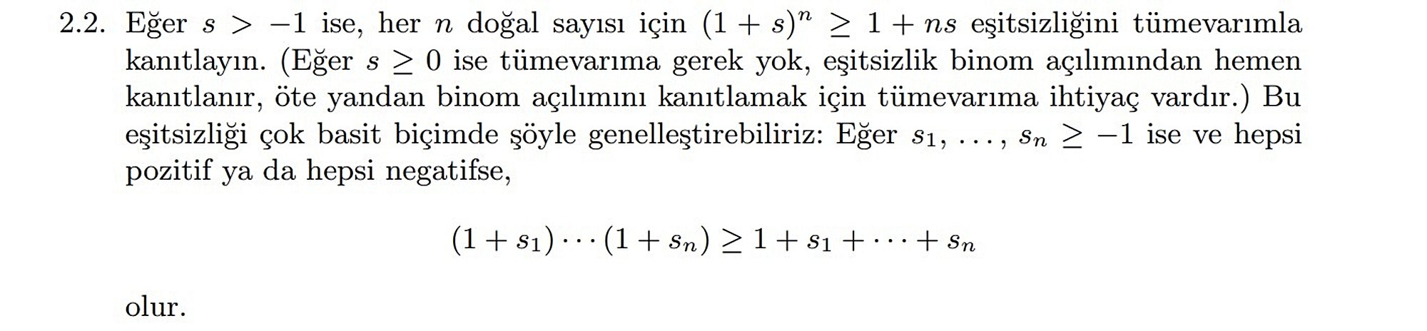"r" reel sayilarda bu arada. Tumevarimi her n>=a icin kullanmayi biliyorum ve durust olmak gerekirse gayet mantikli bir ispat yontemi ama ya n>a. Mesela gorseldeki soruya tam olarak nasil yaklasmaliyim.