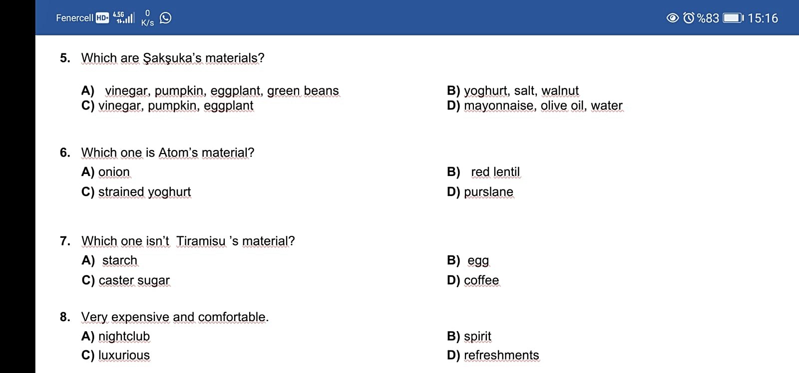 Beşinci soruda ''Şakşuka'' yemeğinin malzemeleri soruluyor. Araştırdığım kadarıyla içerisine ''green bean'' yani yeşil fasulye koyulmuyor. O yüzden cevap C.