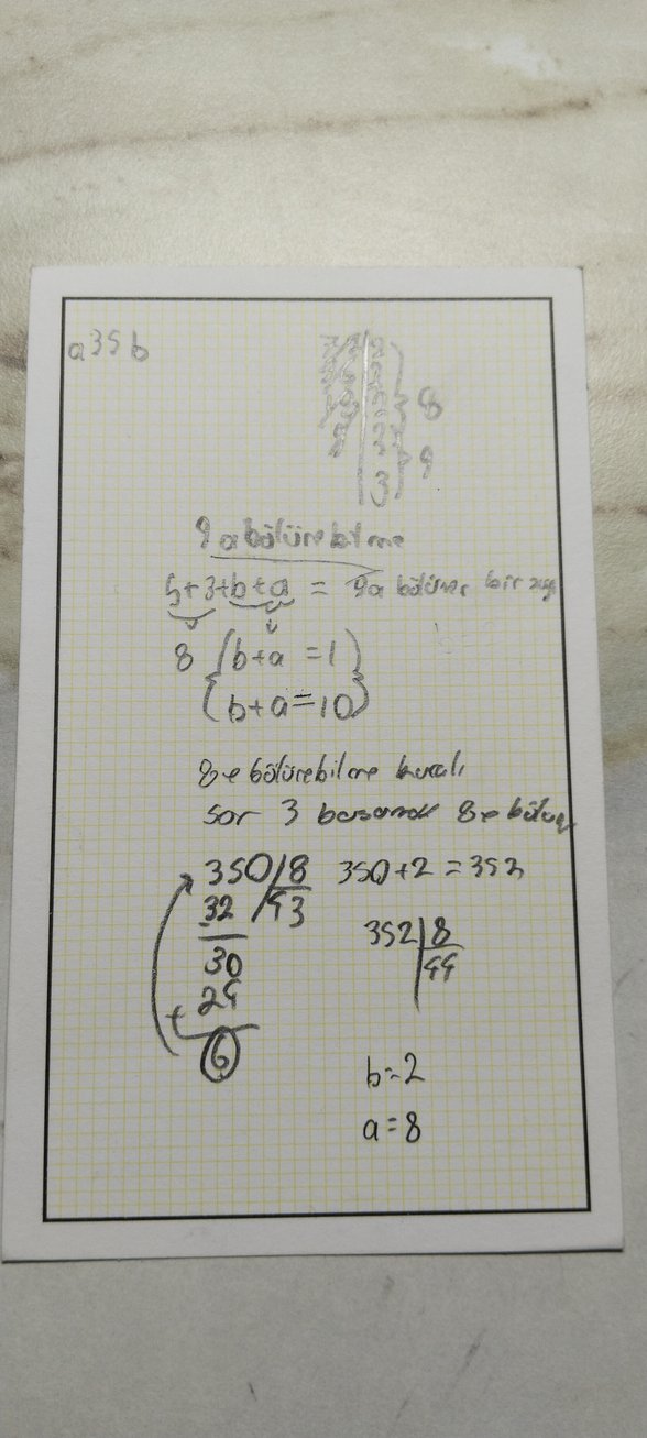 a+3+5+b=9k bu sayıdan bildiklerimiz 3+5=8 şimdi 8 in üstüne ekleme yaparak 9 a bölünmesini sağlamalıyız yani a+b=1 veya a+b=10 olabilir şimdi 8 e bakalım