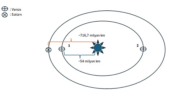 Venüs ile satürn birbirine en yakın olduğu anda (Aşağıdaki çizimde Venüsün 1 numaralı konumda olduğu an) aralarındaki mesafe yaklaşık 662,7 milyon km.