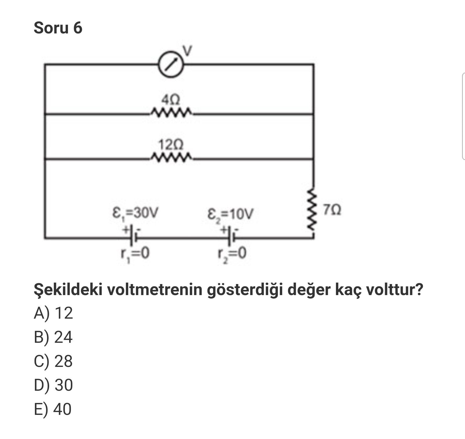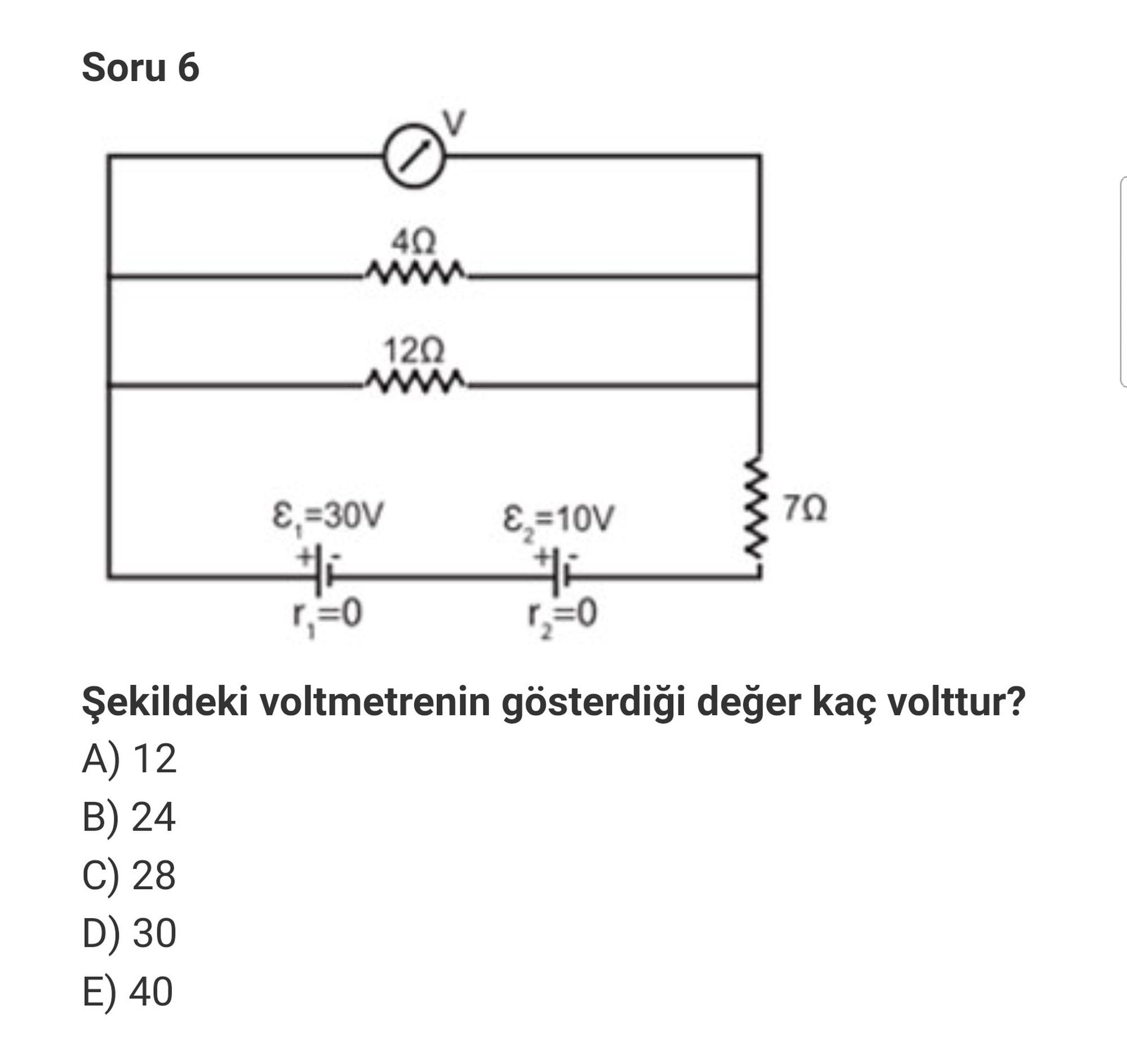 V= i x r ise V= 4 amper x 7 ohm olur. 28 volt buluyorum. Demek ki sorulan kısımda 12 volt gerilim düşüyor, 7 ohmluk dirençte ise 28 volt gerilim düşüyor, paralel bağlı dirençlerimiz aslında 3 ohmluk görev yapıyor ve bu devre toplamda üreteçlerden 10 amper akım çekiyor.